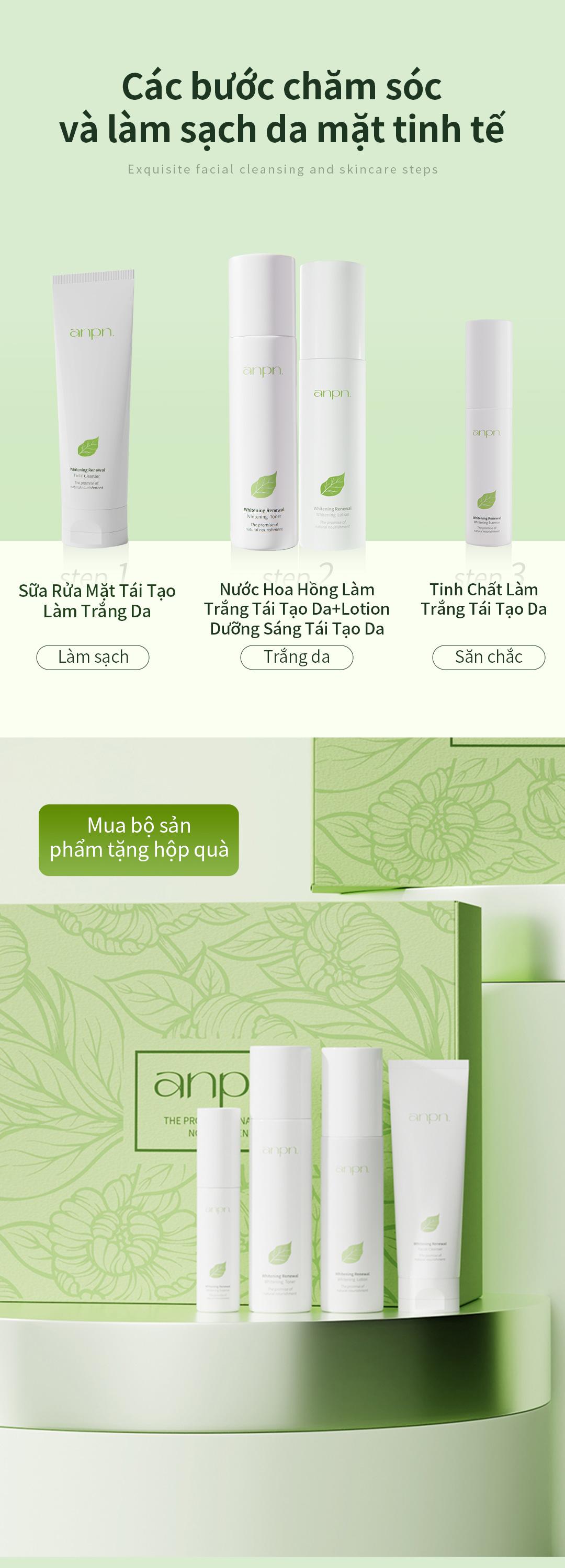 anpn Bộ Sản Phẩm Chăm Sóc Da bao gồm sữa rửa mặt, toner, serum và lotion, giúp dưỡng sáng và phục hồi da.