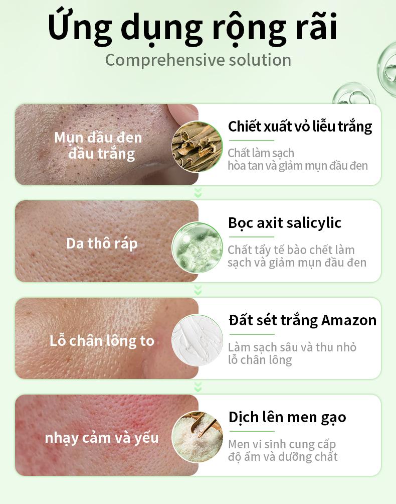 - Công dụng: Kiểm soát lỗ chân lông, làm sạch, tẩy tế bào chết, làm sáng da và kiểm soát dầu.